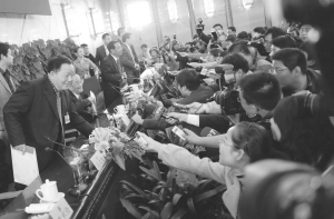 3月6日,全国政协十一届二次会议举行记者会,主题是“为促进经济平稳较快发展建言献策”,厉以宁、李德水、陈锡文、王文彪、方方等五位委员回答记者提问。图为会后记者们意犹未尽,继续采访。谢环驰 摄