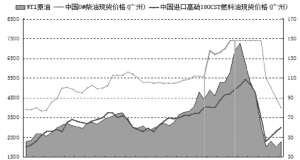 2007年11月至2008年4月间,社会经营加油站的柴油价格由5600元/吨暴涨至7400元/吨,柴油现货供不应求一直未得到有效解决。更具市场化的柴油现货价格变化领先于国际能源市场价格风向标纽约原油期价,更领先于国内燃料油期价变化,证明柴油荒是导致国际油价暴涨的主要因素。