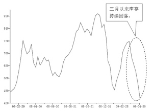 09年一季度,秦皇岛煤炭库存从1月初490万吨的低点不断上行,并于09年2月底达到788万吨的高点,之后持续下降。4月1日,秦皇岛库存为475万吨,较最高点减少312万吨,下降幅度达到40%,库存天数为7.7天,较2月的18.7天减少11天,低于9天的合理水平,为09年以来的最低点。上周煤炭库存继续下降,截至4月7日,秦皇岛煤炭库存为392.53万吨,较3月底下降19%,较2月底下降49%。