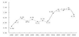 1996-2008年全国房价收入比情况