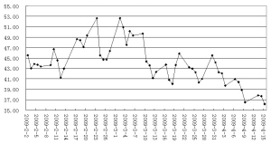 数据显示,银行板块的成交金额占全部A股的比例已经达到阶段性低点,极有可能出现转向。据Wind资讯统计,银行板块成交金额占全部A股的比例在2008年11月7日达到11.91%之后不断下降,4月16日达到4.58%,已经接近上一个低点2008年5月30日的4.26%,也远低于2006年3月以来的平均值6.58%。该比例一旦转向,则意味着大盘股行情开始启动。