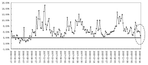 据Wind资讯统计,截至昨日,申万小盘指数的市净率达到7.73倍,申万大盘指数的市净率为2.90倍,小盘指数相对于大盘指数PB的溢价率达到266.55%(小盘指数PB/大盘指数PB*100%),是2003年1月以来的最高点,而统计期内的平均值仅为157.20%。历史数据显示,溢价率分别在2006年7月21日的173.81%、2007年5月25日的181.43%和2008年3月14日的204.33%之后出现回调。但是2009年以来溢价率一直在200%以上,并不断攀升至260%以上,已经远远偏离历史均值并迭创新高,回调的可能性越来越大。