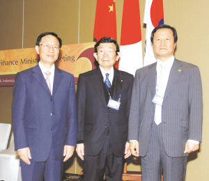 中日韩三国财长会议讨论了东亚区域宏观经济形势和加强东亚财金合作等议题。三国财长特别就清迈倡议多边化有关问题交换了意见,并就三方对筹建中的自我管理的区域外汇储备库的出资份额达成共识:中国出资384亿美元,日本出资384亿美元,韩国出资192亿美元,分别占储备库总额32%、32%和16%。在发生金融危机时,储备库以借贷方式向出现流动性困难的成员提供资金帮助。