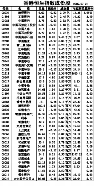 香港恒生指数成份股 2009.07.21