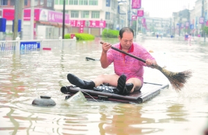 图为10日浙江省温州市苍南县一位居民乘自制的“竹筏”出行。 新华社图片