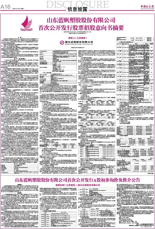 山东蓝帆塑胶股份有限公司首次公开发行A股初步询价及推介公告