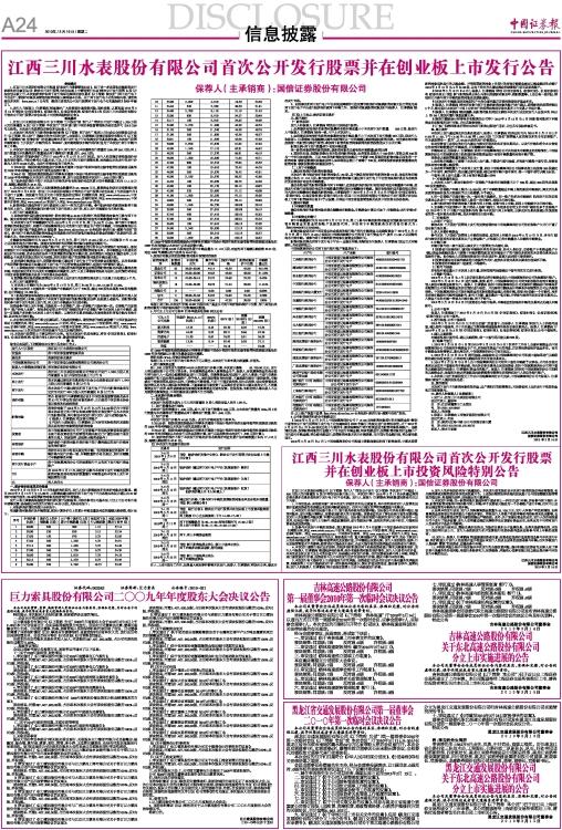 江西三川水表股份有限公司首次公开发行股票并在创业板上市发行公告