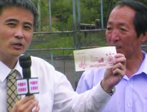 现在再来确定谁是真正的第一股可能意义已经不大,但通过“第一股之争”这个现象,可以看到在那几年中,北京、上海、成都、深圳、抚顺都已经开始涌动股票潮,第一批股票在20世纪80年代初期就已经胎动。图为2001年,李幛喆手拿红砖股票采访发行红砖股票的当事人。(供图/李幛喆)