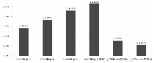 2010年上证综指全年波动幅度只有31.12%,日波幅超过3%的天数占全年的比率只有10.48%。而2006年-2009年,上证综指年振幅分别为145%、141%、232%和89%;2006年上证综指日波幅超过3%的天数占全年的比率达10.46%,2007年为33.05%,2008年高达55.70%,即全年有一半以上的天数波幅超过3%,2009年上证综指的这一比率也达23.97%。