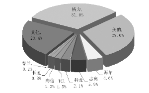 就不同的品牌来看,空调行业经过多年的充分竞争,品牌集中度较高。随着市场竞争的不断成熟,行业格局日趋稳定。2010年全年累积各品牌市占率基本与上年持平,前四家市占率合计超66%。格力、美的全年总销量分别为2656万台和2480万台,市场占有率分别为28%和26%,双寡头销量合计已占据半壁江山。