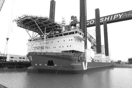 由南通中远船务公司为荷兰一家公司设计建造的世界先进水平的自升式海上风车安装船“探险者”号在江苏南通启东举行命名仪式。该船是目前世界最先进、自动化程度高、集大型风车构件运输、起重和安装功能于一体的海洋专业工程特种船舶。新华社图片