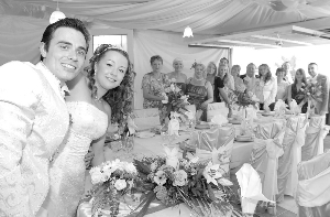 自助餐台上摆放着各式精美的餐具,十几种精致的食品、饮料供客人享用。新郎70多岁的奶奶亲手制作的蔬菜水果榨汁饮料、新郎妈妈制作的彩色小甜点、新娘妈妈制作的各种沙拉……件件都饱含着长辈对新人的祝福以及对客人的款待之情。