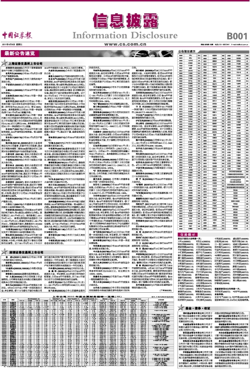 公告版位提示 000002 万科A B013 000012 南玻A B012 000038 *ST大通 A30 000046 泛海建设 B009 000063 中兴通讯 B012 000402 金融街 B052 000417 合肥百货 B014 000532 力合股份 B013 000534 万泽股份 B017 000540 中天城投 B010 000565 渝三峡A B009 000594 国恒铁路 B013 000597 东北制药 A31 000599 青岛双星 B007 000616 亿城股份 B047 000617 石油济柴 A29 000652 泰达股份 B012 000692 惠天热电 B007 000698 沈阳化工 A31 000707 双环科技 B031 000727 华东科技 B027 000768 西飞国际 A31 000778 新兴铸管 B013 000783 长江证券 B009 000790 华神集团 A32 000798 中水渔业 B064 000801 四川九洲 B007 000850 华茂股份 A29 000860 顺鑫农业 B014 000885 同力水泥 B013 000903 云内动力 A32 000917 电广传媒 B008 000929 兰州黄河 B059 000931 中关村 A08 000937 冀中能源 B077 000959 首钢股份 B008 000970 中科三环 B012 000979 中弘地产 A32 000983 西山煤电 B049 000998 隆平高科 B008 001696 宗申动力 B007 002010 传化股份 B011 002016 世荣兆业 B008 002048 宁波华翔 A22 002069 獐子岛 A30 002075 *ST张铜 A30 002109 兴化股份 B005 002118 紫鑫药业 B002 002121 科陆电子 B025 002123 荣信股份 A31 002129 中环股份 B013 002155 辰州矿业 B005 002180 万力达 B002 002198 嘉应制药 B010 002204 华锐铸钢 B069 002225 濮耐股份 B005 002233 塔牌集团 B005 002237 恒邦股份 B023 002254 烟台氨纶 B007 002270 法因数控 B010 002329 皇氏乳业 B009 002376 新北洋 A29 002378 章源钨业 B008 002379 鲁丰股份 B019 002385 大北农 B010 002392 北京利尔 A30 002398 建研集团 B021 002407 多氟多 A22 002408 齐翔腾达 B007 002420 毅昌股份 B002 002429 兆驰股份 B007 002431 棕榈园林 B011 002432 九安医疗 B056 002457 青龙管业 B010 002460 赣锋锂业 B005 002466 天齐锂业 B010 002470 金正大 B011 002473 圣莱达 B057 002486 嘉麟杰 B007 002493 荣盛石化 A29 002502 骅威股份 B054 002504 东光微电 B029 002516 江苏矿达 A22 002520 日发数码 B010 002521 齐峰股份 A22 002533 金杯电工 B011 002535 林州重机 B016 002536 西泵股份 B045 002538 司尔特 A30 002539 新都化工 B014 002552 宝鼎重工 B053 002573 国电清新 A19 300015 爱尔眼科 B043 300178 腾邦国际 B081 300184 力源信息 B060 300202 聚龙股份 A20 300203 聚光科技 A20 300204 舒泰神 A20 600005 武钢股份 B013 600006 东风汽车 B012 600008 首创股份 B066 600016 民生银行 A21 600019 宝钢股份 B008 600021 上海电力 B010 600048 保利地产 A08 600051 宁波联合 B007 600059 古越龙山 B039 600100 同方股份 B035 600106 重庆路桥 B011 600112 长征电气 A31 600128 弘业股份 B005 600129 太极集团 B011 600143 金发科技 A32 600153 建发股份 B076 600160 巨化股份 B011 600161 天坛生物 B083 600178 东安动力 B014 600190 锦州港 B012 600196 复星医药 B011 600198 大唐电信 B008 600211 西藏药业 A30 600240 华业地产 B041 600242 中昌海运 B002 600265 景谷林业 B002 600282 南钢股份 B009 600287 江苏舜天 B012 600289 亿阳信通 A22 600293 三峡新材 B065 600380 健康元 B013 600383 金地集团 B016 600409 三友化工 B013 600428 中远航运 B008 600433 冠豪高新 B009 600459 贵研铂业 A31 600500 中化国际 B009 600503 华丽家族 B009 600515 *ST筑信 B007 600528 中铁二局 A29 600530 交大昂立 B068 600535 天士力 A08 600539 狮头股份 B015 600550 天威保变 A22 600558 大西洋 A31 600563 法拉电子 B014 600565 迪马股份 A31 600572 康恩贝 A32 600573 惠泉啤酒 A32 600580 卧龙电气 B061 600621 上海金陵 A32 600641 万业企业 A29 600645 ST中源 A31 600651 飞乐音响 A32 600664 哈药股份 B071 600697 欧亚集团 B082 600727 *ST鲁北 A29 600730 中国高科 B014 600775 南京熊猫 A32 600784 鲁银投资 B010 600792 ST马龙 B002 600807 天业股份 B014 600839 四川长虹 B033 600884 杉杉股份 B010 600960 滨州活塞 B037 601005 重庆钢铁 B005 601101 昊华能源 B013 601186 中国铁建 B008 601299 中国北车 B073 601328 交通银行 B005 601398 工商银行 B013 601600 中国铝业 B013 601799 星宇股份 A32 601898 中煤能源 B005 601998 中信银行 B005 华安宝利配置证券投资基金 B003 中欧稳健收益债券型证券投资基金 B002 光大保德信信用添益债券型证券投资基金 A25 上证中央企业50交易型 B004 开放式指数证券投资基金 汇添富优势精选混合型证券投资基金 B006 交银施罗德环球精选价值证券投资基金 A23 博时基金 A29 长盛基金 A30 东吴基金 A29 富国基金 A30 国海富兰克林基金 A10 华商基金 B008 景顺长城基金 A31 诺安基金 B016 诺德基金 B014 鹏华基金 A29 信诚基金 B002 兴业全球基金 A30 易方达基金 B008 银华基金 A31 招商基金 A10