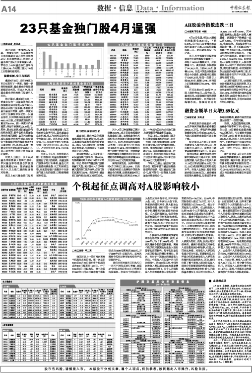 23只基金独门股4月逞强