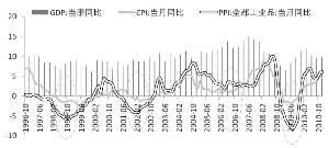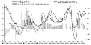 由生产市场供求关系决定的PPI与消费市场供求关系决定的CPI并不存在一致的领先或滞后。在1999—2002年通胀周期中,PPI波动领先CPI约5个月;2002—2006年通胀周期中,PPI仅领先CPI2个月;2006—2009年周期中,PPI波动约滞后CPI2个月。目前处于自2009年下半年以来的新一轮物价波动周期中。2009年下半年以来的物价企稳回升过程中,CPI与PPI表现出持续同步上行特征。CPI由2009年7月的-1.8%持续上涨至3月份的5.4%,PPI由2009年7月-8.2%涨至3月份的7.31%。