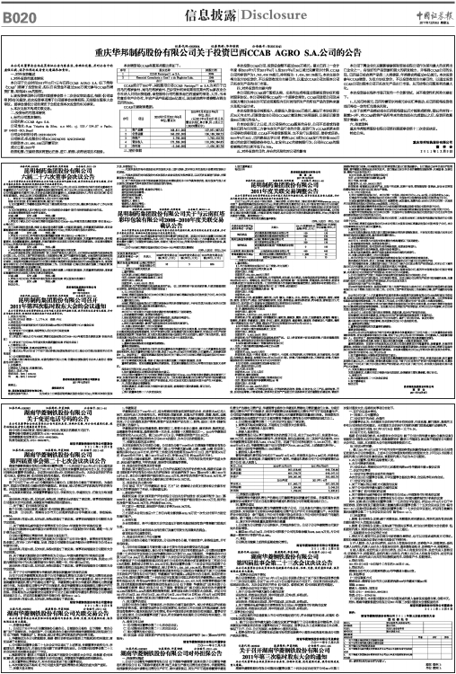 本公司于北京时间2011年12月7日与巴西CCAB AGRO S.A.(以下简称“CCAB”)签署了投资协议,拟以自有资金不超过2000万美元参与CCAB的增资扩股,取得其7.5%的股权。