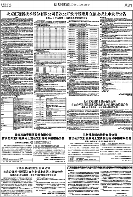 北京汇冠新技术股份有限公司首次公开发行股票并在创业板上市发行公告