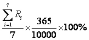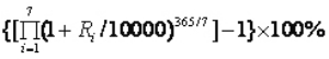 ={[(1+1.2301/10000)×(1+1.257/10000)×(1+2.5166/10000)×(1+1.2629/10000)×(1+1.3931/10000)×(1+1.2049/10000)×(1+1.3421/10000)]365/7-1}×100%