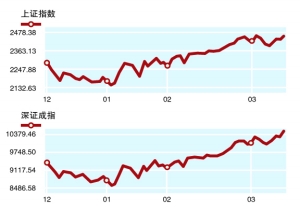 全球市场 WORLD MARKETS 股票市场 沪深300指数 上证综合指数 深证成份指数 创业板指数 香港恒生指数 恒生国企指数 道琼斯工业指数 最新 2681.07 2455.80 10427.24 792.38 21339.70 11356.28 13031.65 涨跌 +26.67 +20.94 +126.74 +6.33 +205.52 +130.37 +71.94 期货市场 连豆-1209 沪铜1206 NYMEX原油 LME3个月铜 最新 4502 61040 106.25 8536.00 涨跌 +22 +480 -0.09 +89.00 债券货币 上证国债指数 中证全债指数 欧元/美元 人民币/美元 本表截至北京时间3月13日 22:30 最新 132.24 140.21 1.3075 6.3259 涨跌 +0.05 -0.01 -0.0080 +0.0023