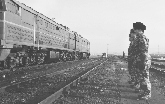 3月14日,阿拉山口边检站战士在宽轨货运执勤现场对出境列车进行监护检查。
