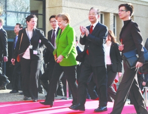 图为温家宝与默克尔共同出席汉诺威工业博览会开幕式。