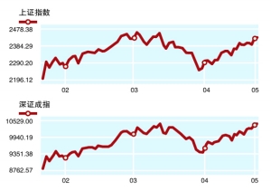 全球市场 WORLD MARKETS 股票市场 沪深300指数 上证综合指数 深证成份指数 创业板指数 香港恒生指数 恒生国企指数 道琼斯工业指数 最新 2715.88 2452.01 10573.60 713.19 21088.06 10877.85 13096.89 涨跌 +24.36 +11.93 +105.22 +13.88 -161.47 -109.21 -109.70 期货市场 连豆-1301 沪铜1207 NYMEX原油 LME3个月铜 最新 4619 58360 99.47 8215.00 涨跌 +4 +20 -3.07 -14.00 债券货币 上证国债指数 中证全债指数 欧元/美元 人民币/美元 最新 132.90 140.65 1.3141 6.2721 涨跌 +0.04 +0.02 -0.0011 -0.0024 本表截至北京时间5月4日 22:30