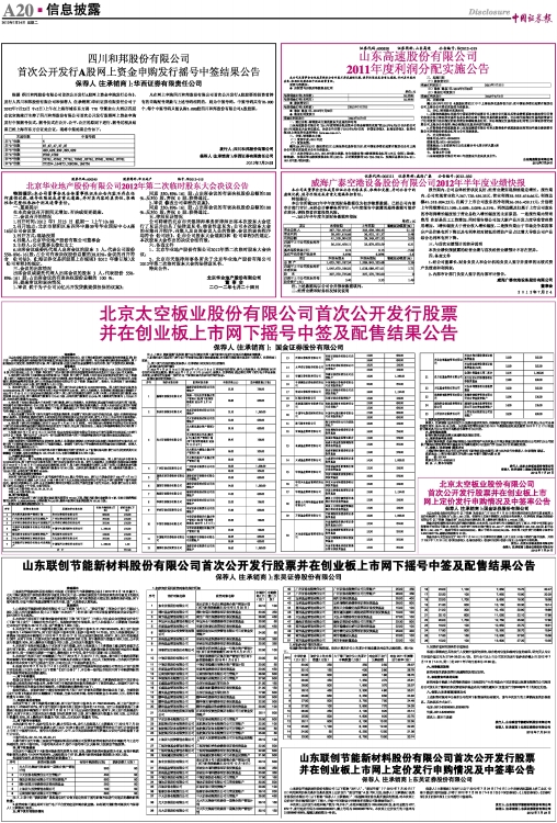 山东联创节能新材料股份有限公司首次公开发行股票并在创业板上市网下摇号中签及配售结果公告