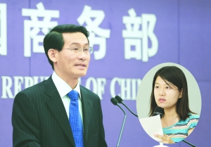 商务部新闻发言人沈丹阳在发布会上回答本报记者倪铭娅的提问。 本报记者 车亮 摄 合成/苏振