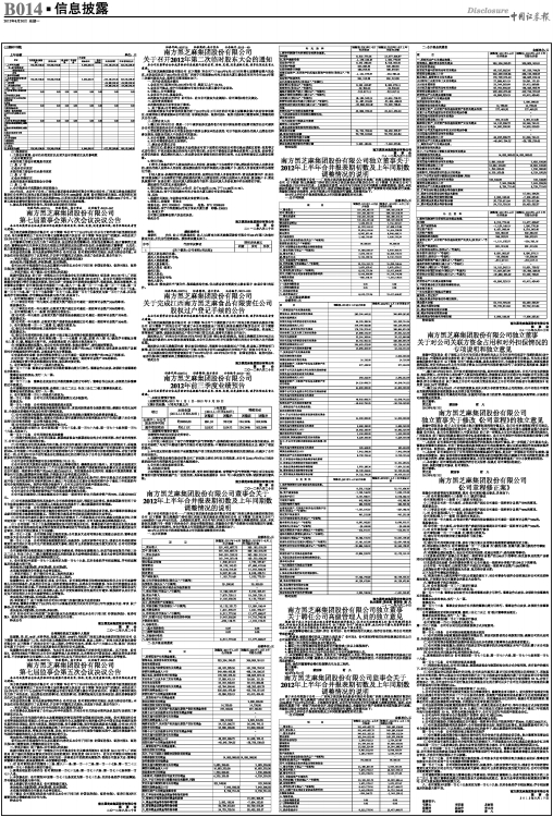 根据中国证监会《关于规范上市公司与关联方资金往来及上市公司对外担保若干问题的通知》及中国证监会、中国银监会联合发布的《关于规范上市公司对外担保行为的通知》等有关规定,作为南方黑芝麻集团股份有限公司(以下简称“公司”)的独立董事,我们本着对公司、全体股东负责的态度,按照实事求是的原则,对公司在2012年上半年关联方资金占用和对外担保的情况进行了必要和认真的核查,现就有关情况作出说明并发表独立意见: