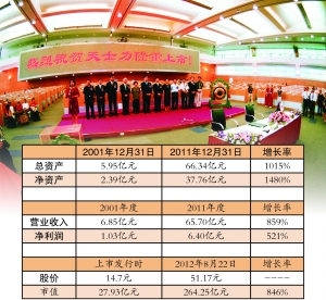 天士力董事长闫希军谈起十年前上市,还记忆犹新,他说,上市前我们用了8年时间,靠着一个科技成果的批文,一个团队,不到一千万的资金,将资产做到1个亿。“但2002年一声锣响,企业的市值瞬间变成了20多亿。而这十年我们借力五大创新体系,今天天士力已成为一家账面净资产近40亿,市值突破260亿的企业(以2012年8月22日收盘价计)。这就是资本的力量,它能够将资金变成资产、资本,将知识资本真正升级!”