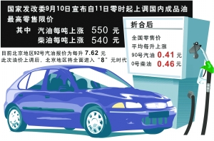 发改委10日发出通知,决定自11日零时起将汽柴油价格每吨分别提高550元和540元,折算到90号汽油和0号柴油(全国平均)每升零售价格分别提高0.41元和0.46元。