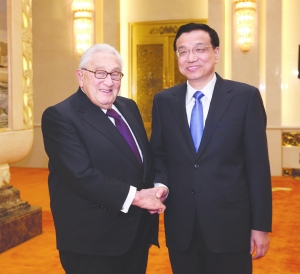 国务院总理李克强25日下午在人民大会堂会见了美国前国务卿基辛格。李克强说,进入新世纪,国际形势发生深刻复杂变化,全球性挑战不断增多,新的国际力量均衡正在构筑,各方唯有协商才能增进共识,唯有合作才能实现共赢与和平。经过40多年的发展,今天的中美利益交融、合作广度深度以及对全球的影响都前所未有。中方愿同美方一道,发展不同于历史以往的新型大国关系,让两国人民共享更多合作成果,并为维护世界和平发挥应有作用。图为李克强会见基辛格。