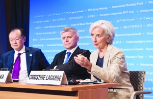 国际货币基金组织总裁克里斯蒂娜·拉加德(右)在记者会上发言。 新华社图片