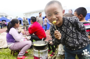 图1:已经入住四川省雅安市芦山县龙门乡晨阳希望学校新建救灾帐篷区的儿童。