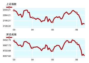 全球市场 WORLD MARKETS 股票市场 沪深300指数 上证综合指数 深证成份指数 创业板指数 香港恒生指数 恒生国企指数 道琼斯工业指数 最新 2403.84 2156.22 8404.50 1073.69 21225.90 9744.48 15202.58 涨跌 -12.93 -5.83 -74.96 +5.54 +256.76 +77.06 +135.62 期货市场 连豆-1401 沪铜1310 NYMEX原油 LME3个月铜 最新 4674 51710 98.18 7088.75 涨跌 -5 +220 +0.33 -2.25 债券货币 上证国债指数 中证全债指数 欧元/美元 人民币/美元 最新 138.04 148.21 1.3353 6.1598 涨跌 +0.05 -0.04 +0.0008 +0.0009 本表截至北京时间6月17日 22:30