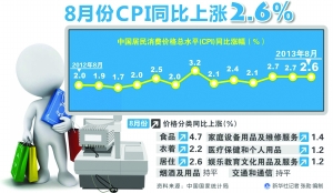 据国家统计局测算,在8月2.6个百分点的CPI同比涨幅中,翘尾因素约1.1个百分点,新涨价因素约1.5个百分点。食品价格同比上涨4.7%,影响CPI同比上涨约1.54个百分点。居住价格同比上涨2.6%,其中住房租金价格上涨4.4%。1至8月份平均,全国CPI同比上涨2.5%。