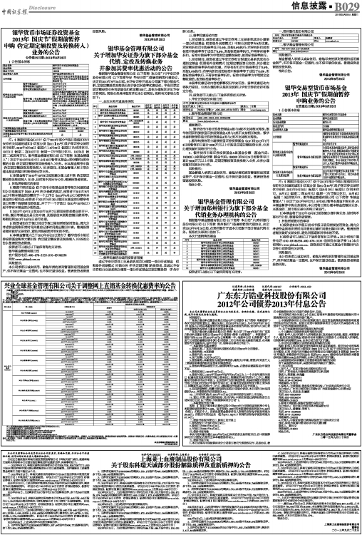 根据银华基金管理有限公司(以下简称“本公司”)与华安证券股份有限公司(以下简称华安“华安证券”)签署的销售代理协议,决定自2013年9月26日起,在华安证券开通本公司旗下部分基金代销、定期定额投资及转换业务并参加其费率优惠活动。华安证券定期定额投资业务每期最低扣款金额100元,具体办理细则详见华安证券网站。转换业务具体规则详见本公司网站。现将有关事项公告如下: