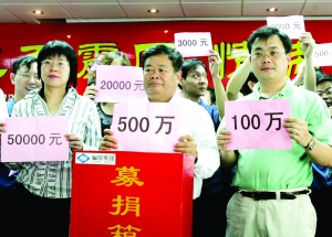 2008年5月15日,为支援四川灾区,曹德旺以个人名义捐款500万元,曹晖(右)以个人名义捐款100万元。CFP图片