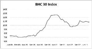 截至2013年10月末,昊樽30指数(BHC 30 Index)报收于1082.27点,较9月末点数(1082.32点)下跌0.05点,环比跌幅0.00%。同期,Liv-ex100指数报收于265.18点,环比下跌2.77点,跌幅-1.03%。昊樽30指数(BHC 30 Index)追踪30款在中国市场认知高、表现相对活跃的高端葡萄酒的价格变化,用于观察高端品种市场的风向标。