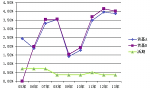 货基A、货基B的历年收益率与同期活期存款利率对比