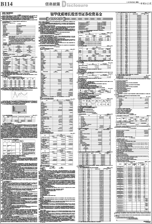 基金管理人:银华基金管理有限公司 基金托管人:中国银行股份有限公司 送出日期:2014年3月28日 §1 重要提示 基金管理人的董事会、董事保证本报告所载资料不存在虚假记载、误导性陈述或重大遗漏,并对其内容的真实性、准确性和完整性承担个别及连带的法律责任。本年度报告已经三分之二以上独立董事签字同意,并由董事长签发。 基金托管人中国银行股份有限公司根据本基金合同规定,于2014年3月26日复核了本报告中的财务指标、净值表现、利润分配情况、财务会计报告、投资组合报告等内容,保证复核内容不存在虚假记载、误导性陈述或者重大遗漏。 基金管理人承诺以诚实信用、勤勉尽责的原则管理和运用基金资产,但不保证基金一定盈利。 基金的过往业绩并不代表其未来表现。投资有风险,投资者在作出投资决策前应仔细阅读本基金的招募说明书及其更新。 本年度报告摘要摘自年度报告正文,投资者欲了解详细内容,应阅读年度报告正文。 本报告财务资料已经审计。 本报告期自2013年1月1日起至12月31日止。 §2 基金简介 2.1 基金基本情况 ■ 2.2 基金产品说明 ■ 2.3 基金管理人和基金托管人 ■ 2.4 信息披露方式 ■ §3 主要财务指标、基金净值表现及利润分配情况 3.1 主要会计数据和财务指标金额单位:人民币元 ■ 注:1、本期已实现收益指基金本期利息收入、投资收益、其他收入(不含公允价值变动收益)扣除相关费用后的余额,本期利润为本期已实现收益加上本期公允价值变动收益。 2、期末可供分配利润采用期末资产负债表未分配利润与未分配利润中已实现部分的孰低数。 3、本报告所列示的基金业绩指标不包括持有人交易基金的各项费用,例如:基金的认购、申购、赎回费等,计入费用后实际收益水平要低于所列数字。 3.2 基金净值表现 3.2.1 基金份额净值增长率及其与同期业绩比较基准收益率的比较 ■ 注:自2011年1月1日起,本基金业绩比较基准变更为沪深300指数收益率×80%+中国债券总指数收益率×20%。由于本基金属于股票型基金,一般情况下股票投资比例大约为80%,本基金采用业界较为公认、市场代表性较好的沪深300 指数和中国债券总指数加权作为本基金的业绩评价基准,权重分别为80%和20%。 3.2.2 自基金合同生效以来基金份额累计净值增长率变动及其与同期业绩比较基准收益率变动的比较 ■ 注:按基金合同规定,本基金自基金合同生效起六个月内为建仓期,截至建仓期结束时本基金的各项投资比例已达到基金合同第十四条:基金的投资(二)投资范围规定的各种比例,本基金股票投资比例浮动范围:60%-95%;除股票资产以外的其他资产投资比例浮动范围为5%-40%,其中现金及到期日在一年以内的政府债券不低于5%。本基金的非现金基金资产中,不低于80%的资产将投资于具有优质增长特征或处于优质增长阶段的公司。 3.2.3 过去五年基金每年净值增长率及其与同期业绩比较基准收益率的比较 ■ 3.3 过去三年基金的利润分配情况单位:人民币元 ■ §4 管理人报告 4.1 基金管理人及基金经理情况 4.1.1 基金管理人及其管理基金的经验 银华基金管理有限公司成立于2001年5月28日,是经中国证监会批准(证监基金字[2001]7号文)设立的全国性资产管理公司。公司注册资本为2亿元人民币,公司的股东及其出资比例分别为:西南证券股份有限公司49%、第一创业证券股份有限公司29%、东北证券股份有限公司21%及山西海鑫实业股份有限公司1%。公司的主要业务是基金募集、基金销售、资产管理及中国证监会许可的其他业务。公司注册地为广东省深圳市。 截至2013年12月31日,本基金管理人管理着35只证券投资基金,具体包括银华优势企业证券投资基金、银华保本增值证券投资基金、银华-道琼斯88精选证券投资基金、银华货币市场证券投资基金、银华核心价值优选股票型证券投资基金、银华优质增长股票型证券投资基金、银华富裕主题股票型证券投资基金、银华领先策略股票型证券投资基金、银华全球核心优选证券投资基金、银华内需精选股票型证券投资基金(LOF)、银华增强收益债券型证券投资基金、银华和谐主题灵活配置混合型证券投资基金、银华沪深300指数证券投资基金(LOF)、银华深证100指数分级证券投资基金、银华信用债券型证券投资基金(LOF)、银华成长先锋混合型证券投资基金、银华信用双利债券型证券投资基金、银华抗通胀主题证券投资基金(LOF)、银华中证等权重90指数分级证券投资基金、银华永祥保本混合型证券投资基金、银华消费主题分级股票型证券投资基金、银华中证内地资源主题指数分级证券投资基金、银华永泰积极债券型证券投资基金、银华中小盘精选股票型证券投资基金、银华纯债信用主题债券型证券投资基金(LOF)、上证50等权重交易型开放式指数证券投资基金、银华上证50等权重交易型开放式指数证券投资基金联接基金、银华中证中票50指数债券型证券投资基金(LOF)、银华永兴纯债分级债券型发起式证券投资基金、银华交易型货币市场基金、银华中证成长股债恒定组合30/70指数证券投资基金、银华信用四季红债券型证券投资基金、银华中证转债指数增强分级证券投资基金、银华信用季季红债券型证券投资基金和银华中证800等权重指数增强分级证券投资基金。同时,本基金管理人管理着多个全国社保基金、企业年金和