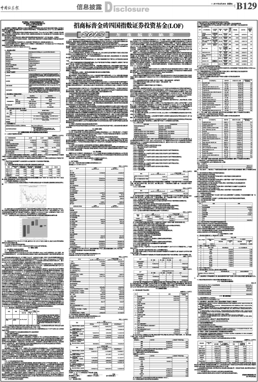 基金管理人:招商基金管理有限公司 基金托管人:中国银行股份有限公司 送出日期:2014年3月28日 §1 重要提示 基金管理人的董事会、董事保证本报告所载资料不存在虚假记载、误导性陈述或重大遗漏,并对其内容的真实性、准确性和完整性承担个别及连带的法律责任。本年度报告已经三分之二以上独立董事签字同意,并由董事长签发。 基金托管人中国银行股份有限公司根据本基金合同规定,于2014年3月26日复核了本报告中的财务指标、净值表现、利润分配情况、财务会计报告、投资组合报告等内容,保证复核内容不存在虚假记载、误导性陈述或者重大遗漏。 基金管理人承诺以诚实信用、勤勉尽责的原则管理和运用基金资产,但不保证基金一定盈利。 基金的过往业绩并不代表其未来表现。投资有风险,投资者在作出投资决策前应仔细阅读本基金的招募说明书及其更新。 本年度报告摘要摘自年度报告正文,投资者欲了解详细内容,应阅读年度报告正文。 本报告财务资料已经审计,德勤华永会计师事务所(特殊普通合伙)为本基金出具了2013年度无保留意见的审计报告,请投资者注意阅读。 本报告期自2013年1月1日起至12月31日止。 §2 基金简介 2.1 基金基本情况 ■ 2.2 基金产品说明 ■ 2.3 基金管理人和基金托管人 ■ 2.4 境外投资顾问和境外资产托管人 ■ 2.5 信息披露方式 ■ §3 主要财务指标、基金净值表现及利润分配情况 3.1 主要会计数据和财务指标 金额单位:人民币元 ■ 注:1、本期已实现收益指基金本期利息收入、投资收益、其他收入(不含公允价值变动收益)扣除相关费用后的余额,本期利润为本期已实现收益加上本期公允价值变动收益; 2、上述基金业绩指标不包括持有人认购或交易基金的各项费用,计入费用后实际收益水平要低于所列数字; 3、期末可供分配利润等于未分配利润与未分配利润中已实现部分的孰低数。 3.2 净值表现 3.2.1 基金份额净值增长率及其与同期业绩比较基准收益率的比较 ■ 注:1、业绩比较基准=标准普尔金砖四国40总收益指数(S&P BRIC 40 Index(Net TR))收益率,业绩比较基准在每个交易日实现再平衡; 2、同期业绩比较基准以人民币计价。 3.2.2 自基金合同生效以来基金份额累计净值增长率变动及其与同期业绩比较基准收益率变动的比较 ■ 注:根据本基金合同投资范围的规定:本基金股票等权益类资产的投资比例不低于基金资产的90%,其中投资于标的指数成份股、备选成份股的资产占基金资产的比例不低于80%。现金及到期日在一年以内的政府债券的比例不低于基金资产净值的5%。本基金于2011年2月11日成立,自基金成立日起6个月内为建仓期,建仓期结束时(2011年8月5日)相关比例均符合上述规定的要求。 3.2.3 自基金合同生效以来基金每年净值增长率及其与同期业绩比较基准收益率的比较 ■ 注:本基金合同于2011年2月11日生效,截至2011年12月31日成立未满1年,故成立当年的净值增长率按当年实际存续期计算。 3.3 过去三年基金的利润分配情况 本基金于2011年2月11日成立,自基金合同生效日以来未进行利润分配。 §4 管理人报告 4.1 基金管理人及基金经理情况 4.1.1 基金管理人及其管理基金的经验 招商基金管理有限公司于2002年12月27日经中国证监会(2002)100号文批准设立,是中国第一家中外合资基金管理公司。公司的经营范围包括发起设立基金、基金管理业务和中国证监会批准的其它业务。 经招商基金管理有限公司(以下简称“本公司”)股东会审议通过,并经中国证券监督管理委员会证监许可[2013]1074号文批复同意,本公司原股东荷兰投资公司(ING Asset Management B.V.)将其持有的本公司21.6%股权转让给招商银行股份有限公司、11.7%股权转让给招商证券股份有限公司,截止2013年10月份,本次股权转让的相关工商变更登记手续已办理完毕。 目前,本公司的股东股权结构为:招商银行股份有限公司持有公司全部股权的55%,招商证券股份有限公司持有公司全部股权的45%。公司注册资本金为2.1亿元人民币。招商基金拥有两家全资子公司,分别为招商财富资产管理有限公司和招商资产管理(香港)有限公司。 截至2013年12月31日,本基金管理人共管理三十五只共同基金,具体如下:从2003年4月28日起管理招商安泰系列开放式证券投资基金(含招商安泰股票证券投资基金、招商安泰平衡型证券投资基金、招商安泰债券投资基金);从2004年1月14日起管理招商现金增值开放式证券投资基金;从2004年6月1日起开始管理招商先锋证券投资基金;从2005年11月17日起开始管理招商优质成长股票型证券投资基金(LOF);从2006年7月11日起开始管理招商安本增利债券型证券投资基金;从2007年3月30日起开始管理招商核心价值混合型证券投资基金;从2008年6月19日起开始管理招商大盘蓝筹股票型证券投资基金;从2008年10月22日起开始管理招商安心收益债券型证券投资基金;从2009年6月19日起开始管理招商行业领先股票型证券投资基金;从2009年12月25日起开始管理招商中小盘精选股票型证券投资基金;从2010年3月25日起开始管理招商全球资源股票型证券投资基金(QDII);从2010年6月22日起开始管理招商深证100指数证券投资基金;从2010年6月25日起开始管理招商信用添利债券型证券投资基金;从2010年12月8日开始管理上证消费80交易型开放式指数证券投资基金及招商上证消费80交易型开放式指数证券投资基金联