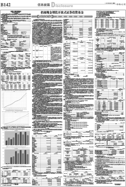 基金管理人:招商基金管理有限公司 基金托管人:招商银行股份有限公司 送出日期:2014年3月28日 §1 重要提示 基金管理人的董事会、董事保证本报告所载资料不存在虚假记载、误导性陈述或重大遗漏,并对其内容的真实性、准确性和完整性承担个别及连带的法律责任。本年度报告已经三分之二以上独立董事签字同意,并由董事长签发。 基金托管人招商银行股份有限公司根据本基金合同规定,于2014年3月26日复核了本报告中的财务指标、净值表现、利润分配情况、财务会计报告、投资组合报告等内容,保证复核内容不存在虚假记载、误导性陈述或者重大遗漏。 基金管理人承诺以诚实信用、勤勉尽责的原则管理和运用基金资产,但不保证基金一定盈利。 基金的过往业绩并不代表其未来表现。投资有风险,投资者在作出投资决策前应仔细阅读本基金的招募说明书及其更新。 本年度报告摘要摘自年度报告正文,投资者欲了解详细内容,应阅读年度报告正文。 本报告财务资料已经审计,德勤华永会计师事务所(特殊普通合伙)为本基金出具了2013年度无保留意见的审计报告,请投资者注意阅读。 本报告期自2013年1月1日起至12月31日止。 §2 基金简介 2.1 基金基本情况 ■ 2.2 基金产品说明 ■ 2.3 基金管理人和基金托管人 ■ 2.4 信息披露方式 ■ §3 主要财务指标、基金净值表现及利润分配情况 3.1 主要会计数据和财务指标 1、招商现金增值货币A 金额单位:人民币元 ■ 2、招商现金增值货币B 金额单位:人民币元 ■ 注:1、本期已实现收益指基金本期利息收入、投资收益、其他收入(不含公允价值变动收益)扣除相关费用后的余额,本期利润为本期已实现收益加上本期公允价值变动收益,由于货币市场基金采用摊余成本法核算,所以,公允价值变动收益为零,本期已实现收益和本期利润的金额相等。 2、本基金无持有人认购或交易基金的各项费用。 3、本基金收益分配为按日结转份额。 3.2 基金表现 3.2.1 基金份额净值收益率及其与同期业绩比较基准收益率的比较 招商现金增值货币A ■ 招商现金增值货币B ■ 3.2.2 自基金合同生效以来基金累计净值收益率变动及其与同期业绩比较基准收益率变动的比较 ■ ■ 注:根据基金合同第十四条(五)投资限制的规定:本基金投资于债券及相关品种不低于基金总资产的80%,本基金于2004年01月14日成立,自基金成立日起45个工作日内为建仓期,建仓期结束时投资范围符合上述规定的要求。 3.2.3 过去五年基金每年净值收益率及其与同期业绩比较基准收益率的比较 ■ ■ 注:本基金分级日期为2009年12月1日,招商现金增值货币B2009年度净值收益率按当年实际存续期计算。 3.3 过去三年基金的利润分配情况 1、招商现金增值货币A 单位:人民币元 ■ 2、招商现金增值货币B 单位:人民币元 ■ 注:本基金采取的收益分配方式是:每日计算投资人帐户当日所产生的收益,每月将投资人账户累计的收益结转为其基金份额,计入该投资人账户的本基金份额中。 §4 管理人报告 4.1 基金管理人及基金经理情况 4.1.1 基金管理人及其管理基金的经验 招商基金管理有限公司于2002年12月27日经中国证监会(2002)100号文批准设立,是中国第一家中外合资基金管理公司。公司的经营范围包括发起设立基金、基金管理业务和中国证监会批准的其它业务。 经招商基金管理有限公司(以下简称“本公司”)股东会审议通过,并经中国证券监督管理委员会证监许可[2013]1074号文批复同意,本公司原股东荷兰投资公司(ING Asset Management B.V.)将其持有的本公司21.6%股权转让给招商银行股份有限公司、11.7%股权转让给招商证券股份有限公司,截止2013年10月份,本次股权转让的相关工商变更登记手续已办理完毕。 目前,本公司的股东股权结构为:招商银行股份有限公司持有公司全部股权的55%,招商证券股份有限公司持有公司全部股权的45%。公司注册资本金为2.1亿元人民币。招商基金拥有两家全资子公司,分别为招商财富资产管理有限公司和招商资产管理(香港)有限公司。 截至2013年12月31日,本基金管理人共管理三十五只共同基金,具体如下:从2003年4月28日起管理招商安泰系列开放式证券投资基金(含招商安泰股票证券投资基金、招商安泰平衡型证券投资基金、招商安泰债券投资基金);从2004年1月14日起管理招商现金增值开放式证券投资基金;从2004年6月1日起开始管理招商先锋证券投资基金;从2005年11月17日起开始管理招商优质成长股票型证券投资基金(LOF);从2006年7月11日起开始管理招商安本增利债券型证券投资基金;从2007年3月30日起开始管理招商核心价值混合型证券投资基金;从2008年6月19日起开始管理招商大盘蓝筹股票型证券投资基金;从2008年10月22日起开始管理招商安心收益债券型证券投资基金;从2009年6月19日起开始管理招商行业领先股票型证券投资基金;从2009年12月25日起开始管理招商中小盘精选股票型证券投资基金;从2010年3月25日起开始管理招商全球资源股票型证券投资基金(QDII);从2010年6月22日起开始管理招商深证100指数证券投资基金;从2010年6月25日起开始管理招商信用添利债券型证券投资基金;从2010年12月8日开始管理上证消费80交易型开放式指数证券投资基金及招商上证消费80交易型开放式指数证券投资基金联接基金;从2011年2月11日起开始管理招商标普金砖四国指数证券投资基金(LOF);从20
