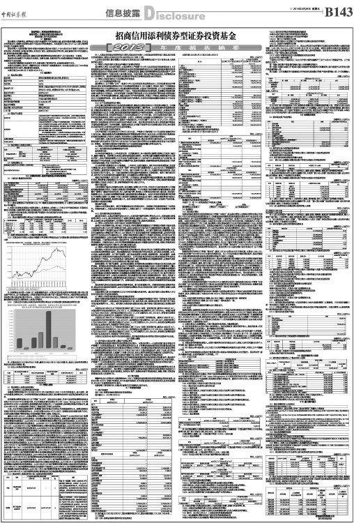 基金管理人:招商基金管理有限公司 基金托管人:中国农业银行股份有限公司 送出日期:2014年3月28日 §1 重要提示 基金管理人的董事会、董事保证本报告所载资料不存在虚假记载、误导性陈述或重大遗漏,并对其内容的真实性、准确性和完整性承担个别及连带的法律责任。本年度报告已经三分之二以上独立董事签字同意,并由董事长签发。 基金托管人中国农业银行股份有限公司根据本基金合同规定,于2014年3月26日复核了本报告中的财务指标、净值表现、利润分配情况、财务会计报告、投资组合报告等内容,保证复核内容不存在虚假记载、误导性陈述或者重大遗漏。 基金管理人承诺以诚实信用、勤勉尽责的原则管理和运用基金资产,但不保证基金一定盈利。 基金的过往业绩并不代表其未来表现。投资有风险,投资者在作出投资决策前应仔细阅读本基金的招募说明书及其更新。 本年度报告摘要摘自年度报告正文,投资者欲了解详细内容,应阅读年度报告正文。 本报告财务资料已经审计,德勤华永会计师事务所(特殊普通合伙)为本基金财务出具了2013年度无保留意见的审计报告,请投资者注意阅读。 本报告期自2013年1月1日起至12月31日止。 §2 基金简介 2.1 基金基本情况 ■ 2.2 基金产品说明 ■ 2.3 基金管理人和基金托管人 ■ 2.4 信息披露方式 ■ §3 主要财务指标、基金净值表现及利润分配情况 3.1 主要会计数据和财务指标 金额单位:人民币元 ■ 注:1、基金业绩指标不包括持有人认(申)购或交易基金的各项费用,计入费用后实际收益水平要低于所列数字; 2、本期已实现收益指基金本期利息收入、投资收益、其他收入(不含公允价值变动收益)扣除相关费用后的余额,本期利润为本期已实现收益加上本期公允价值变动收益; 3、对期末可供分配利润,采用期末资产负债表中未分配利润与未分配利润中已实现部分的孰低数; 3.2 基金净值表现 3.2.1 基金份额净值增长率及其与同期业绩比较基准收益率的比较 ■ 注:业绩比较基准收益率=中债综合指数收益率。 3.2.2 自基金合同生效以来基金份额累计净值增长率变动及其与同期业绩比较基准收益率变动的比较 ■ 注:根据基金合同第十四条(四)投资策略的规定:本基金对固定收益类证券的投资比例不低于基金资产的80%,其中投资级别以上的信用债券的投资比例不低于基金资产的80%,对股票等权益类证券的投资比例不超过基金资产的20%。本基金于2010年6月25日成立,自基金成立日起6个月内为建仓期,建仓期结束时相关比例均符合上述规定的要求。 3.2.3 自基金合同生效以来基金每年净值增长率及其与同期业绩比较基准收益率的比较 ■ 注:本基金合同于2010年6月25日生效,截至2010年12月31日成立未满1年,故成立当年的净值增长率按当年实际存续期计算。 3.3 过去三年基金的利润分配情况 单位:人民币元 ■ §4 管理人报告 4.1 基金管理人及基金经理情况 4.1.1 基金管理人及其管理基金的经验 招商基金管理有限公司于2002年12月27日经中国证监会(2002)100号文批准设立,是中国第一家中外合资基金管理公司。公司的经营范围包括发起设立基金、基金管理业务和中国证监会批准的其它业务。 经招商基金管理有限公司(以下简称“本公司”)股东会审议通过,并经中国证券监督管理委员会证监许可[2013]1074号文批复同意,本公司原股东荷兰投资公司(ING Asset Management B.V.)将其持有的本公司21.6%股权转让给招商银行股份有限公司、11.7%股权转让给招商证券股份有限公司,截止2013年10月份,本次股权转让的相关工商变更登记手续已办理完毕。 目前,本公司的股东股权结构为:招商银行股份有限公司持有公司全部股权的55%,招商证券股份有限公司持有公司全部股权的45%。公司注册资本金为2.1亿元人民币。招商基金拥有两家全资子公司,分别为招商财富资产管理有限公司和招商资产管理(香港)有限公司。 截至2013年12月31日,本基金管理人共管理三十五只共同基金,具体如下:从2003年4月28日起管理招商安泰系列开放式证券投资基金(含招商安泰股票证券投资基金、招商安泰平衡型证券投资基金、招商安泰债券投资基金);从2004年1月14日起管理招商现金增值开放式证券投资基金;从2004年6月1日起开始管理招商先锋证券投资基金;从2005年11月17日起开始管理招商优质成长股票型证券投资基金(LOF);从2006年7月11日起开始管理招商安本增利债券型证券投资基金;从2007年3月30日起开始管理招商核心价值混合型证券投资基金;从2008年6月19日起开始管理招商大盘蓝筹股票型证券投资基金;从2008年10月22日起开始管理招商安心收益债券型证券投资基金;从2009年6月19日起开始管理招商行业领先股票型证券投资基金;从2009年12月25日起开始管理招商中小盘精选股票型证券投资基金;从2010年3月25日起开始管理招商全球资源股票型证券投资基金(QDII);从2010年6月22日起开始管理招商深证100指数证券投资基金;从2010年6月25日起开始管理招商信用添利债券型证券投资基金;从2010年12月8日开始管理上证消费80交易型开放式指数证券投资基金及招商上证消费80交易型开放式指数证券投资基金联接基金;从2011年2月11日起开始管理招商标普金砖四国指数证券投资基金(LOF);从2011年3月17日起开始管理招商安瑞进取债券型证券投资基金;从2011年6月27日开始管理深证电子信息传媒产业(TMT)50交易型开