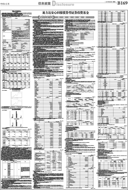 基金管理人:易方达基金管理有限公司 基金托管人:中国工商银行股份有限公司 送出日期:二〇一四年三月二十八日 §1重要提示 基金管理人的董事会、董事保证本报告所载资料不存在虚假记载、误导性陈述或重大遗漏,并对其内容的真实性、准确性和完整性承担个别及连带的法律责任。本年度报告已经三分之二以上独立董事签字同意,并由董事长签发。 基金托管人中国工商银行股份有限公司根据本基金合同规定,于2014年3月24日复核了本报告中的财务指标、净值表现、利润分配情况、财务会计报告、投资组合报告等内容,保证复核内容不存在虚假记载、误导性陈述或者重大遗漏。 基金管理人承诺以诚实信用、勤勉尽责的原则管理和运用基金资产,但不保证基金一定盈利。 基金的过往业绩并不代表其未来表现。投资有风险,投资者在作出投资决策前应仔细阅读本基金的招募说明书及其更新。 本年度报告摘要摘自年度报告正文,投资者欲了解详细内容,应阅读年度报告正文。 本报告中财务资料已经审计。安永华明会计师事务所(特殊普通合伙)为本基金出具了标准无保留意见的审计报告,请投资者注意阅读。 本报告期自2013年1月1日起至12月31日止。 §2基金简介 2.1基金基本情况 ■ 2.2基金产品说明 ■ 2.3基金管理人和基金托管人 ■ 2.4信息披露方式 ■ §3主要财务指标、基金净值表现及利润分配情况 3.1主要会计数据和财务指标 金额单位:人民币元 ■ 注:1.所述基金业绩指标不包括持有人认购或交易基金的各项费用,计入费用后实际收益水平要低于所列数字。 2.本期已实现收益指基金本期利息收入、投资收益、其他收入(不含公允价值变动收益)扣除相关费用后的余额,本期利润为本期已实现收益加上本期公允价值变动收益。 3.本基金合同于2011年6月21日生效,合同生效当期的相关数据和指标按实际存续期计算。 3.2基金净值表现 3.2.1基金份额净值增长率及其与同期业绩比较基准收益率的比较 易方达安心回报债券A ■ 易方达安心回报债券B ■ 3.2.2 自基金合同生效以来基金份额累计净值增长率变动及其与同期业绩比较基准收益率变动的比较 易方达安心回报债券型证券投资基金 份额累计净值增长率与业绩比较基准收益率历史走势对比图 (2011年6月21日至2013年12月31日) 易方达安心回报债券A (2011年6月21日至2013年12月31日) ■ 注:1.按基金合同和招募说明书的约定,本基金的建仓期为六个月,建仓期结束时各项资产配置比例符合基金合同(第十一部分三、投资范围和五、投资限制)的有关约定。 2. 自基金合同生效至报告期末,A类基金份额净值增长率为11.84%,B类基金份额净值增长率为11.04%,同期业绩比较基准收益率为14.31%。 3.2.3 自基金合同生效以来基金每年净值增长率及其与同期业绩比较基准收益率的比较 易方达安心回报债券型证券投资基金 自基金合同生效以来每年净值增长率图 易方达安心回报债券A ■ 易方达安心回报债券B ■ 注:本基金合同生效日为2011年6月21日,合同生效当年期间的相关数据和指标按实际存续期计算。 3.3过去三年基金的利润分配情况 1、易方达安心回报债券A 单位:人民币元 ■ 2、易方达安心回报债券B 单位:人民币元 ■ §4管理人报告 4.1基金管理人及基金经理情况 4.1.1基金管理人及其管理基金的经验 经中国证监会证监基金字[2001]4号文批准,易方达基金管理有限公司成立于2001年4月17日,注册资本1.2亿元。截至2013年12月31日,公司的股东为广东粤财信托有限公司、广发证券股份有限公司、盈峰投资控股集团有限公司、广东省广晟资产经营有限公司和广州市广永国有资产经营有限公司。公司现有全国社保基金投资管理人、企业年金投资管理人、QDII 和特定资产管理业务资格。 自成立以来,易方达基金管理有限公司秉承“取信于市场,取信于社会”的宗旨,坚持“在诚信规范的前提下,通过专业化运作和团队合作实现持续稳健的增长”的经营理念,努力以规范的运作、良好的业绩和优质的服务,为投资者创造最佳的回报。 截至2013年12月31日,易方达基金管理有限公司共管理1只封闭式基金、54只开放式基金。封闭式基金有科瑞证券投资基金;开放式基金有易方达平稳增长证券投资基金、易方达策略成长证券投资基金、易方达50指数证券投资基金、易方达积极成长证券投资基金、易方达货币市场基金、易方达稳健收益债券型证券投资基金、易方达深证100交易型开放式指数基金、易方达价值精选股票型证券投资基金、易方达策略成长二号混合型证券投资基金、易方达价值成长混合型证券投资基金、易方达科讯股票型证券投资基金、易方达增强回报债券型证券投资基金、易方达中小盘股票型证券投资基金、易方达科汇灵活配置混合型证券投资基金、易方达科翔股票型证券投资基金、易方达行业领先企业股票型证券投资基金、易方达沪深300交易型开放式指数发起式证券投资基金联接基金、易方达深证100交易型开放式指数证券投资基金联接基金、易方达亚洲精选股票型证券投资基金、易方达上证中盘交易型开放式指数证券投资基金、易方达上证中盘交易型开放式指数证券投资基金联接基金、易方达消费行业股票型证券投资基金、易方达岁丰添利债券型证券投资基金、易方达医疗保健行业股票型证券投资基金、易方达黄金主题证券投
