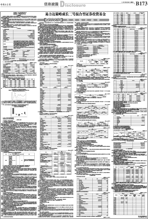 基金管理人:易方达基金管理有限公司 基金托管人:中国银行股份有限公司 送出日期:二〇一四年三月二十八日 §1重要提示 基金管理人的董事会、董事保证本报告所载资料不存在虚假记载、误导性陈述或重大遗漏,并对其内容的真实性、准确性和完整性承担个别及连带的法律责任。本年度报告已经三分之二以上独立董事签字同意,并由董事长签发。 基金托管人中国银行股份有限公司根据本基金合同规定,于2014年3月24日复核了本报告中的财务指标、净值表现、利润分配情况、财务会计报告、投资组合报告等内容,保证复核内容不存在虚假记载、误导性陈述或者重大遗漏。 基金管理人承诺以诚实信用、勤勉尽责的原则管理和运用基金资产,但不保证基金一定盈利。 基金的过往业绩并不代表其未来表现。投资有风险,投资者在作出投资决策前应仔细阅读本基金的招募说明书及其更新。 本年度报告摘要摘自年度报告正文,投资者欲了解详细内容,应阅读年度报告正文。 本报告中财务资料已经审计。安永华明会计师事务所(特殊普通合伙)为本基金出具了标准无保留意见的审计报告,请投资者注意阅读。 本报告期自2013年1月1日起至12月31日止。 §2基金简介 2.1 基金基本情况 ■ 2.2 基金产品说明 ■ 2.3 基金管理人和基金托管人 ■ 2.4 信息披露方式 ■ §3主要财务指标、基金净值表现及利润分配情况 3.1 主要会计数据和财务指标 金额单位:人民币元 ■ 注:1.所述基金业绩指标不包括持有人认购或交易基金的各项费用,计入费用后实际收益水平要低于所列数字。 2.本期已实现收益指基金本期利息收入、投资收益、其他收入(不含公允价值变动收益)扣除相关费用后的余额,本期利润为本期已实现收益加上本期公允价值变动收益。 3.2基金净值表现 3.2.1基金份额净值增长率及其与同期业绩比较基准收益率的比较 ■ 3.2.2 自基金合同生效以来基金份额累计净值增长率变动及其与同期业绩比较基准收益率变动的比较 易方达策略成长二号混合型证券投资基金 份额累计净值增长率与业绩比较基准收益率历史走势对比图 (2006年8月16日至2013年12月31日) ■ 注:1.按基金合同和招募说明书的约定,本基金的建仓期为六个月,建仓期结束时各项资产配置比例符合基金合同(第十四部分(二)投资范围、(四)投资策略和(七)投资禁止行为与限制)的有关约定。 2.自基金合同生效至报告期末,基金份额净值增长率为194.99%,同期业绩比较基准收益率为30.75%。 3.2.3 过去五年基金每年净值增长率及其与同期业绩比较基准收益率的比较 易方达策略成长二号混合型证券投资基金 过去五年每年净值增长率图 ■ 3.3过去三年基金的利润分配情况 本基金过去三年未发生利润分配。 §4管理人报告 4.1基金管理人及基金经理情况 4.1.1基金管理人及其管理基金的经验 经中国证监会证监基金字[2001]4号文批准,易方达基金管理有限公司成立于2001年4月17日,注册资本1.2亿元。截至2013年12月31日,公司的股东为广东粤财信托有限公司、广发证券股份有限公司、盈峰投资控股集团有限公司、广东省广晟资产经营有限公司和广州市广永国有资产经营有限公司。公司现有全国社保基金投资管理人、企业年金投资管理人、QDII 和特定资产管理业务资格。 自成立以来,易方达基金管理有限公司秉承“取信于市场,取信于社会”的宗旨,坚持“在诚信规范的前提下,通过专业化运作和团队合作实现持续稳健的增长”的经营理念,努力以规范的运作、良好的业绩和优质的服务,为投资者创造最佳的回报。 截至2013年12月31日,易方达基金管理有限公司共管理1只封闭式基金、54只开放式基金。封闭式基金有科瑞证券投资基金;开放式基金有易方达平稳增长证券投资基金、易方达策略成长证券投资基金、易方达50指数证券投资基金、易方达积极成长证券投资基金、易方达货币市场基金、易方达稳健收益债券型证券投资基金、易方达深证100交易型开放式指数基金、易方达价值精选股票型证券投资基金、易方达策略成长二号混合型证券投资基金、易方达价值成长混合型证券投资基金、易方达科讯股票型证券投资基金、易方达增强回报债券型证券投资基金、易方达中小盘股票型证券投资基金、易方达科汇灵活配置混合型证券投资基金、易方达科翔股票型证券投资基金、易方达行业领先企业股票型证券投资基金、易方达沪深300交易型开放式指数发起式证券投资基金联接基金、易方达深证100交易型开放式指数证券投资基金联接基金、易方达亚洲精选股票型证券投资基金、易方达上证中盘交易型开放式指数证券投资基金、易方达上证中盘交易型开放式指数证券投资基金联接基金、易方达消费行业股票型证券投资基金、易方达岁丰添利债券型证券投资基金、易方达医疗保健行业股票型证券投资基金、易方达黄金主题证券投资基金(LOF)、易方达安心回报债券型证券投资基金、易方达资源行业股票型证券投资基金、易方达创业板交易型开放式指数证券投资基金、易方达创业板交易型开放式指数证券投资基金联接基金、易方达双债增强债券型证券投资基金、易方达纯债债券型证券投资基金、易方达标普全球高端消费品指数增强型证券投资基金、易方达永旭添利定期开放债券型证券投资基金、易方达恒生中国企业交易型开放式