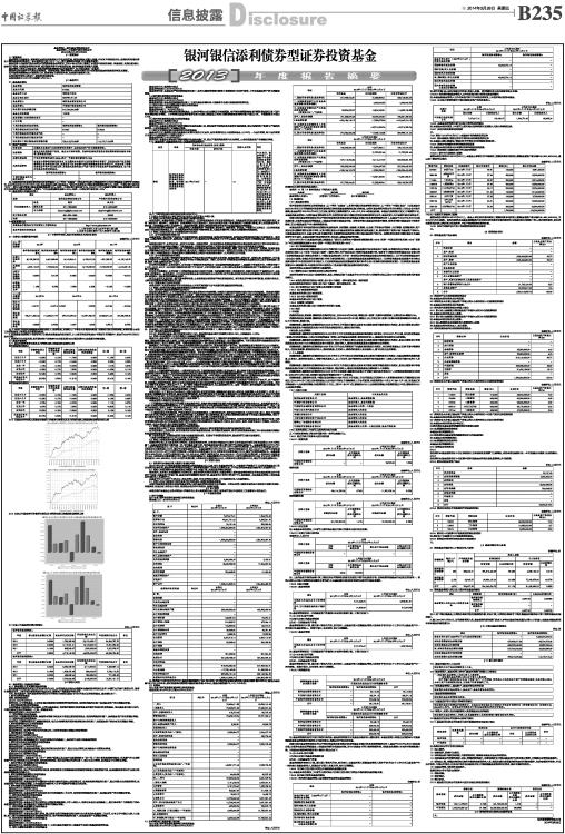 基金管理人:银河基金管理有限公司 基金托管人:中信银行股份有限公司 送出日期:2014年3月28日 §1 重要提示 1.1 重要提示 基金管理人的董事会、董事保证本报告所载资料不存在虚假记载、误导性陈述或重大遗漏,并对其内容的真实性、准确性和完整性承担个别及连带的法律责任。本年度报告已经三分之二以上独立董事签字同意,并由董事长签发。 基金托管人中信银行股份有限公司根据本基金合同规定,于2014年3月26日复核了本报告中的财务指标、净值表现、利润分配情况、财务会计报告、投资组合报告等内容,保证复核内容不存在虚假记载、误导性陈述或者重大遗漏。 基金管理人承诺以诚实信用、勤勉尽责的原则管理和运用基金资产,但不保证基金一定盈利。 基金的过往业绩并不代表其未来表现。投资有风险,投资者在作出投资决策前应仔细阅读本基金的招募说明书及其更新。 本年度报告摘要摘自年度报告正文,投资者欲了解详细内容,应阅读年度报告正文。 本报告财务资料已经审计,请投资者注意阅读。 本报告期自2013年1月1日起至12月31日止。 §2 基金简介 2.1 基金基本情况 ■ 2.2 基金产品说明 ■ 注:为提高银河银信添利债券型证券投资基金(以下简称“本基金”)的业绩与业绩比较基准的可比性和增强基金业绩评价的透明性,本公司决定自2013年1月21日起,将本基金的业绩比较基准由“新华巴克莱资本中国全债指数涨跌幅*80%+税后一年期定期存款利率*20%”(原名为新华雷曼中国全债指数涨跌幅*80%+税后一年期定期存款利率*20%,2008年11月7日起新华雷曼中国全债指数更名为新华巴克莱资本中国全债指数),变更为“中证全债指数收益率×80%+税后一年期定期存款利率×20%”。 2.3 基金管理人和基金托管人 ■ 2.4信息披露方式 ■ §3 主要财务指标、基金净值表现及利润分配情况 3.1 主要会计数据和财务指标 金额单位:人民币元 ■ 注:1、本期已实现收益指基金本期利息收入、投资收益、其他收入(不含公允价值变动收益)扣除相关费用后的余额,本期利润为本期已实现收益加上本期公允价值变动收益。 2、所述基金业绩指标不包括持有人认购或交易基金的各项费用,计入费用后实际收益水平要低于所列数字(基金于2008年5月23日进行分级)。 3、对期末可供分配利润,采用期末资产负债表中未分配利润与未分配利润中已实现部分的孰低数。 3.2 基金净值表现 3.2.1 基金份额净值增长率及其与同期业绩比较基准收益率的比较 银河银信添利债券A ■ 银河银信添利债券B ■ 3.2.2 自基金合同生效以来基金份额累计净值增长率变动及其与同期业绩比较基准收益率变动的比较 ■ ■ 3.2.3 过去五年基金每年净值增长率及其与同期业绩比较基准收益率的比较 ■ ■ 3.3 过去三年基金的利润分配情况 单位:人民币元 ■ ■ §4 管理人报告 4.1 基金管理人及基金经理情况 4.1.1 基金管理人及其管理基金的经验 银河基金管理有限公司设立于2002年6月14日,公司的股东分别为中国银河金融控股有限责任公司、中国石油天然气集团公司、首都机场集团公司、上海市城市建设投资开发总公司、湖南电广传媒股份有限公司。 目前,除本基金外,银河基金管理有限公司另管理1只封闭式基金与16只开放式证券投资基金,基本情况如下: 1、银丰证券投资基金 类型:契约型封闭式 成立日:2002年8月15日 投资目标:为平衡型基金,力求有机融合稳健型和进取型两种投资风格,在控制风险的前提下追求基金资产的长期稳定增值。 2、银河银联系列证券投资基金 本系列基金为契约型开放式基金,由两只基金构成,包括银河稳健证券投资基金和银河收益证券投资基金,每只基金彼此独立运作,并通过基金间相互转换构成一个统一的基金体系。 基金合同生效日:2003年8月4日 (1)银河稳健证券投资基金 投资目标:以稳健的投资风格,构造资本增值与收益水平适度匹配的投资组合,在控制风险的前提下,追求基金资产的长期稳定增值。 (2)银河收益证券投资基金 投资目标:以债券投资为主,兼顾股票投资,在充分控制风险和保持较高流动性的前提下,实现基金资产的安全及长期稳定增值。 3、银河银泰理财分红证券投资基金 基金运作方式:契约型开放式 基金合同生效日:2004年3月30日 基金投资目标:追求资产的安全性和流动性,为投资者创造长期稳定的投资回报 4、银河银富货币市场基金 基金运作方式:契约型开放式 基金合同生效日:2004年12月20日 基金投资目标:在确保基金资产安全和高流动性的基础上,追求高于业绩比较基准的回报 5、银河竞争优势成长股票型证券投资基金 基金运作方式:契约型开放式 基金合同生效日:2008年5月26日 基金投资目标:在有效控制风险、保持良好流动性的前提下,通过主动式管理,追求基金中长期资本增值。 6、银河行业优选股票型证券投资基金 基金运作方式:契约型开放式 基金合同生效日:2009年4月24日 基金投资目标: 本基金将“自上而下”的资产配置以及动态行业配置策略与“自下而上”的个股优选策略相结合,优选景气行业或预期景气行业中的优势企业进行投资,在有效控制风险、保持良好流动性的前提下,通过主动式管理,追求基金中长期资本增值。 7、银河沪深300价值指数证券投资基金 基金运作方式:契约型开放式 基金合同生效日:2009年12月28日 基金投资目标:通过严格的投资程序约
