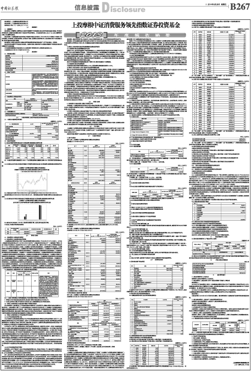 基金管理人:上投摩根基金管理有限公司 基金托管人:中国建设银行股份有限公司 报告送出日期:二〇一四年三月二十八日 §1 重要提示 1.1 重要提示 基金管理人的董事会、董事保证本报告所载资料不存在虚假记载、误导性陈述或重大遗漏,并对其内容的真实性、准确性和完整性承担个别及连带的法律责任。本年度报告已经三分之二以上独立董事签字同意,并由董事长签发。 基金托管人中国建设银行股份有限公司根据本基金合同规定,于2014年3月27日复核了本报告中的财务指标、净值表现、利润分配情况、财务会计报告、投资组合报告等内容,保证复核内容不存在虚假记载、误导性陈述或者重大遗漏。 基金管理人承诺以诚实信用、勤勉尽责的原则管理和运用基金资产,但不保证基金一定盈利。 基金的过往业绩并不代表其未来表现。投资有风险,投资者在作出投资决策前应仔细阅读本基金的招募说明书及其更新。 本年度报告摘要摘自年度报告正文,投资者欲了解详细内容,应阅读年度报告正文。 本报告期自2013年1月1日起至12月31日止。 §2 基金简介 2.1 基金基本情况 ■ 2.2 基金产品说明 ■ 2.3 基金管理人和基金托管人 ■ 2.4 信息披露方式 ■ §3 主要财务指标、基金净值表现及利润分配情况 3.1 主要会计数据和财务指标 金额单位:人民币元 ■ 3.2 基金净值表现 3.2.1基金份额净值增长率及其与同期业绩比较基准收益率的比较 ■ 注:本基金的业绩比较基准为:95%×中证消费服务领先指数收益率+5%×税后银行活期存款收益率。 3.2.2自基金合同生效以来基金份额累计净值增长率变动及其与同期业绩比较基准收益率变动的比较 上投摩根中证消费服务领先指数证券投资基金 份额累计净值增长率与业绩比较基准收益率历史走势对比图 (2012年9月25日至2013年12月31日) ■ 注:本基金合同生效日为2012年9月25日,图示时间段为2012年9月25日至2013年12月31日。 基金建仓期自2012年9月25日至2013年3月24日,建仓期结束时资产配置比例符合本基金基金合同规定。 3.2.3自基金合同生效以来基金每年净值增长率及其与同期业绩比较基准收益率的比较 上投摩根中证消费服务领先指数证券投资基金 合同生效日以来净值增长率与业绩比较基准收益率的柱形对比图 ■ 注:基金合同生效当年(2012年)按实际存续期计算,未按自然年度进行折算。 3.3过去三年基金的利润分配情况 单位:人民币元 ■ §4 管理人报告 4.1 基金管理人及基金经理情况 4.1.1基金管理人及其管理基金的经验 上投摩根基金管理有限公司经中国证券监督管理委员会批准,于2004年5月12日正式成立。公司由上海国际信托投资有限公司(2007年10月8日更名为“上海国际信托有限公司”)与摩根资产管理(英国)有限公司合资设立,注册资本为2.5亿元人民币,注册地上海。截至2013年12月底,公司管理的基金共有二十九只,均为开放式基金,分别是:上投摩根中国优势证券投资基金、上投摩根货币市场基金、上投摩根阿尔法股票型证券投资基金、上投摩根双息平衡混合型证券投资基金、上投摩根成长先锋股票型证券投资基金、上投摩根内需动力股票型证券投资基金、上投摩根亚太优势股票型证券投资基金、上投摩根双核平衡混合型证券投资基金、上投摩根中小盘股票型证券投资基金、上投摩根纯债债券型证券投资基金、上投摩根行业轮动股票型证券投资基金、上投摩根大盘蓝筹股票型证券投资基金、上投摩根全球新兴市场股票型证券投资基金、上投摩根新兴动力股票型证券投资基金、上投摩根强化回报债券型证券投资基金、上投摩根健康品质股票型证券投资基金、上投摩根全球天然资源股票型证券投资基金、上投摩根分红添利债券型证券投资基金、上投摩根中证消费服务领先指数证券投资基金、上投摩根核心优选股票型证券投资基金、上投摩根轮动添利债券型证券投资基金、上投摩根智选30股票型证券投资基金、上投摩根成长动力股票型证券投资基金、上证180高贝塔交易型开放式指数证券投资基金、上投摩根天颐年丰混合型证券投资基金、上投摩根岁岁盈定期开放债券型证券投资基金、上投摩根红利回报混合型证券投资基金、上投摩根转型动力灵活配置混合型证券投资基金和上投摩根双债增利债券型证券投资基金。 4.1.2基金经理(或基金经理小组)及基金经理助理的简介 ■ 注:1. 任职日期和离任日期均指根据公司决定确定的聘任日期和解聘日期。 2. 黄栋先生为本基金首任基金经理,其任职日期为本基金基金合同生效之日; 3. 证券从业的含义遵从行业协会《证券业从业人员资格管理办法》的相关规定。 4.2 管理人对报告期内本基金运作遵规守信情况的说明 在本报告期内,基金管理人不存在损害基金份额持有人利益的行为,勤勉尽责地为基金份额持有人谋求利益。本基金管理人遵守了《证券投资基金法》及其他有关法律法规、《上投摩根中证消费服务领先指数证券投资基金基金合同》的规定。除以下情况外,基金经理对个股和投资组合的比例遵循了投资决策委员会的授权限制,基金投资比例符合基金合同和法律法规的要求:本基金曾出现个别由于市场原因引起的投资组合的投资指标被动偏离相关比例要求的情形,但已在规定时间内调整完毕。 4.3 管理人对报告期内公平交易情况的专项说明 4.3.1公平交易制度和控制方