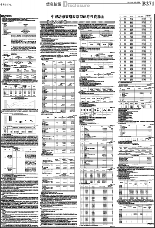 基金管理人:中银基金管理有限公司 基金托管人:中国工商银行股份有限公司 报告送出日期:二〇一四年三月二十八日 §1 重要提示 1.1 重要提示 基金托管人中国工商银行股份有限公司根据本基金合同规定,于2014年3月25日复核了本报告中的财务指标、净值表现、利润分配情况、财务会计报告、投资组合报告等内容,保证复核内容不存在虚假记载、误导性陈述或者重大遗漏。 基金管理人承诺以诚实信用、勤勉尽责的原则管理和运用基金资产,但不保证基金一定盈利。 基金的过往业绩并不代表其未来表现。投资有风险,投资者在作出投资决策前应仔细阅读本基金的招募说明书及其更新。 本年度报告摘要摘自年度报告正文,投资者欲了解详细内容,应阅读年度报告正文。 本报告期自2013年1月1日起至12月31日止。 §2 基金简介 2.1 基金基本情况 ■ 2.2 基金产品说明 ■ 2.3 基金管理人和基金托管人 ■ 2.4 信息披露方式 ■ §3 主要财务指标、基金净值表现及利润分配情况 3.1 主要会计数据和财务指标 ■ 注:1、所述基金业绩指标不包括持有人认购或交易基金的各项费用,计入费用后实际收益水平要低于所列数字。 2、本期已实现收益指基金本期利息收入、投资收益、其他收入(不含公允价值变动收益)扣除相关费用后的余额,本期利润为本期已实现收益加上本期公允价值变动收益。期末可供分配收益,采用期末资产负债表中未分配利润与未分配利润中已实现部分的孰低数(为期末余额),即如果期末未分配利润(报表数,下同)的未实现部分为正数,则期末可供分配利润的金额为期末未分配利润的已实现部分,如果期末未分配利润的未实现部分为负数,则期末可供分配利润的金额为期末未分配利润(已实现部分扣除未实现部分)。 3.2 基金净值表现 3.2.1 基金份额净值增长率及其与同期业绩比较基准收益率的比较 ■ 3.2.2 自基金合同生效以来基金份额累计净值增长率变动及其与同期业绩比较基准收益率变动的比较 中银动态策略股票型证券投资基金 份额累计净值增长率与业绩比较基准收益率的历史走势对比图 (2008年4月3日至2013年12月31日) ■ 注:按基金合同规定,本基金自基金合同生效起6个月内为建仓期,截至建仓结束时本基金的各项投资比例已达到基金合同第十一部分(二)的规定,即本基金投资组合中,股票投资的比例范围为基金资产的60%-95%;债券、权证、资产支持证券、货币市场工具及国家证券监管机构允许基金投资的其他金融工具占基金资产的比例范围为0-40%;其中现金或者到期日在一年以内的政府债券不低于基金资产净值的5%,持有权证的市值不超过基金资产净值的3%。对于中国证监会允许投资的创新金融产品,将依据有关法律法规进行投资管理。 3.2.3 过去五年基金每年净值增长率及其与同期业绩比较基准收益率的比较 中银动态策略股票型证券投资基金 过去五年基金净值增长率与业绩比较基准收益率的对比图 ■ 3.3 过去三年基金的利润分配情况 单位:人民币元 ■ §4 管理人报告 4.1 基金管理人及基金经理情况 4.1.1 基金管理人及其管理基金的经验 中银基金管理有限公司前身为中银国际基金管理有限公司,于2004年8月12日正式成立,由中银国际和美林投资管理合资组建(2006年9月29日美林投资管理有限公司与贝莱德投资管理有限公司合并,合并后新公司名称为“贝莱德投资管理有限公司”)。2007年12月25日,经中国证券监督管理委员会批复,同意中国银行股份有限公司直接控股中银基金。公司注册地为中国上海市,注册资本为一亿元人民币,其中中国银行拥有83.5%的股权,贝莱德投资管理拥有16.5%的股权。截至2013年12月31日,本管理人共管理三十四只开放式证券投资基金:中银中国精选混合型开放式证券投资基金、中银货币市场证券投资基金、中银持续增长股票型证券投资基金、中银收益混合型证券投资基金、中银动态策略股票型证券投资基金、中银稳健增利债券型证券投资基金、中银行业优选灵活配置混合型证券投资基金、中银中证100指数增强型证券投资基金、中银蓝筹精选灵活配置混合型证券投资基金、中银价值精选灵活配置混合型证券投资基金、中银稳健双利债券型证券投资基金、中银全球策略证券投资基金(FOF)、上证国有企业100交易型开放式指数证券投资基金、中银转债增强债券型证券投资基金、中银中小盘成长股票型证券投资基金、中银信用增利债券型证券投资基金、中银沪深300等权重指数证券投资基金(LOF)、中银主题策略股票型证券投资基金、中银保本混合型证券投资基金、中银理财14天债券型证券投资基金、中银理财60天债券型发起式证券投资基金、中银纯债债券型证券投资基金、中银理财7天债券型证券投资基金、中银理财30天债券型证券投资基金、中银稳健添利债券型发起式证券投资基金、中银标普全球精选自然资源等权重指数证券投资基金、中银消费主题股票型证券投资基金、中银美丽中国股票型证券投资基金、中银盛利纯债一年定期开放债券型证券投资基金(LOF)、中银保本二号混合型证券投资基金、中银互利分级债券型证券投资基金、中银惠利纯债半年定期开放债券型证券投资基金、中银中高等级债券型证券投资基金、中银理财21天债券型证券投资基金,同时管理着多个特定客户资产管理投资组合。 4.1.2 基金经理(或基金经