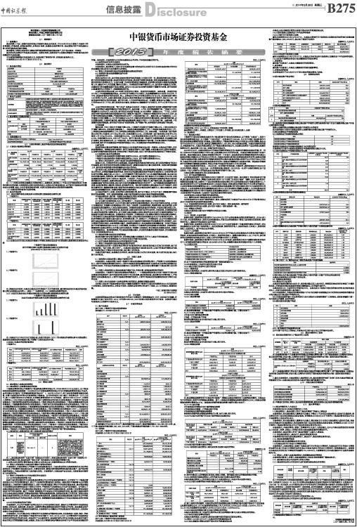基金管理人:中银基金管理有限公司 基金托管人:中国工商银行股份有限公司 报告送出日期:二〇一四年三月二十八日 §1 重要提示 1.1 重要提示 基金托管人中国工商银行股份有限公司根据本基金合同规定,于2014年3月25日复核了本报告中的财务指标、净值表现、利润分配情况、财务会计报告、投资组合报告等内容,保证复核内容不存在虚假记载、误导性陈述或者重大遗漏。 基金管理人承诺以诚实信用、勤勉尽责的原则管理和运用基金资产,但不保证基金一定盈利。 基金的过往业绩并不代表其未来表现。投资有风险,投资者在作出投资决策前应仔细阅读本基金的招募说明书及其更新。 本年度报告摘要摘自年度报告正文,投资者欲了解详细内容,应阅读年度报告正文。 本报告期自2013年1月1日起至12月31日止。 §2 基金简介 2.1 基金基本情况 ■ 2.2 基金产品说明 ■ 2.3 基金管理人和基金托管人 ■ 2.4 信息披露方式 ■ §3 主要财务指标、基金净值表现及利润分配情况 3.1 主要会计数据和财务指标 金额单位:人民币元 ■ 注:(1)本期已实现收益指基金本期利息收入、投资收益、其他收入(不含公允价值变动收益)扣除相关费用后的余额,本期利润为本期已实现收益加上本期公允价值变动收益,由于货币市场基金采用摊余成本法核算,因此,公允价值变动收益为零,本期已实现收益和本期利润的金额相等。 (2)本基金利润分配按月结转份额。 3.2 基金净值表现 3.2.1 基金份额净值收益率及其与同期业绩比较基准收益率的比较 1.中银货币A: ■ 2.中银货币B: ■ 3.2.2自基金合同生效以来基金份额累计净值收益率变动及其与同期业绩比较基准收益率变动的比较 中银货币市场证券投资基金 累计净值收益率与业绩比较基准收益率历史走势对比图 (2005年6月7日至2013年12月31日) 1、中银货币A ■ 2、中银货币B ■ 注:按基金合同规定,本基金自基金合同生效起6个月内为建仓期,截至建仓结束时本基金的各项投资比例已达到基金合同第十一部分(二)投资范围、(六)投资组合限制的规定。 3.2.3 过去五年基金每年净值收益率及其与同期业绩比较基准收益率的比较 中银货币市场证券投资基金 过去五年基金净值收益率与业绩比较基准收益率的对比图 1、中银货币A ■ 2、中银货币B ■ 注:本基金于2012年3月29日实施分级,分级生效当年(2012)的B类基金净值增长率与同期业绩比较基准收益率按实际存续期计算,不按整个自然年度进行折算。 3.3过去三年基金的利润分配情况 中银货币A: 单位:人民币元 ■ 中银货币B: 单位:人民币元 ■ §4 管理人报告 4.1 基金管理人及基金经理情况 4.1.1基金管理人及其管理基金的经验 中银基金管理有限公司前身为中银国际基金管理有限公司,于2004年8月12日正式成立,由中银国际和美林投资管理合资组建(2006年9月29日美林投资管理有限公司与贝莱德投资管理有限公司合并,合并后新公司名称为“贝莱德投资管理有限公司”)。2007年12月25日,经中国证券监督管理委员会批复,同意中国银行股份有限公司直接控股中银基金。公司注册地为中国上海市,注册资本为一亿元人民币,其中中国银行拥有83.5%的股权,贝莱德投资管理拥有16.5%的股权。截至2013年12月31日,本管理人共管理三十四只开放式证券投资基金:中银中国精选混合型开放式证券投资基金、中银货币市场证券投资基金、中银持续增长股票型证券投资基金、中银收益混合型证券投资基金、中银动态策略股票型证券投资基金、中银稳健增利债券型证券投资基金、中银行业优选灵活配置混合型证券投资基金、中银中证100指数增强型证券投资基金、中银蓝筹精选灵活配置混合型证券投资基金、中银价值精选灵活配置混合型证券投资基金、中银稳健双利债券型证券投资基金、中银全球策略证券投资基金(FOF)、上证国有企业100交易型开放式指数证券投资基金、中银转债增强债券型证券投资基金、中银中小盘成长股票型证券投资基金、中银信用增利债券型证券投资基金、中银沪深300等权重指数证券投资基金(LOF)、中银主题策略股票型证券投资基金、中银保本混合型证券投资基金、中银理财14天债券型证券投资基金、中银理财60天债券型发起式证券投资基金、中银纯债债券型证券投资基金、中银理财7天债券型证券投资基金、中银理财30天债券型证券投资基金、中银稳健添利债券型发起式证券投资基金、中银标普全球精选自然资源等权重指数证券投资基金、中银消费主题股票型证券投资基金、中银美丽中国股票型证券投资基金、中银盛利纯债一年定期开放债券型证券投资基金(LOF)、中银保本二号混合型证券投资基金、中银互利分级债券型证券投资基金、中银惠利纯债半年定期开放债券型证券投资基金、中银中高等级债券型证券投资基金、中银理财21天债券型证券投资基金,同时管理着多个特定客户资产管理投资组合。 4.1.2基金经理(或基金经理小组)及基金经理助理的简介 ■ 注:1、首任基金经理的“任职日期”为基金合同生效日,非首任基金经理的“任职日期”为根据公司决定确定的聘任日期,基金经理的“离任日期”均为根据公司决定确定的解聘日期; 2、证券从业年限的计算标准及含义遵从《证券业从业人员资格管理办法》的相关规定。 4.2 管理人对报告期内本基金运作遵规守信情况的说明 本报告期内,本